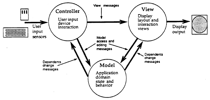 ならば、原典を当たるしかありません。もともとGUIのシステムをSmalltalkでプログラミングするときに考えられたモデルのようです。その原典がこの論文→“A Cookbook for Using the Model-View-Controller User Interface Paradigm in Smalltalk-80,” Krasner & Pope, Journal of Object Oriented Programming (1988)。この論文に出てくる図が大元です。