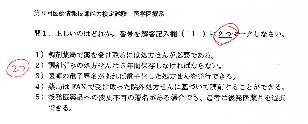 医療情報技師試験では3科目の試験があります。そのうち医療情報システム系と医学・医療系には、正解を2つ選ぶ問題や、正解数が明示されていない(1つかもしれないし、2つ以上かもしれない)問題が混ざっています。2つ(以上)解答しなければならないのに、答を考えるのに必死になっていると、指示を見落として1つしかマークしなかったりします。
