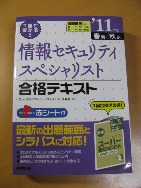 今回新たに、成美堂出版より『1回で受かる! 情報セキュリティスペシャリスト合格テキスト '11年版』を出版しました。私も共著者として執筆に加わりましたが、残念ながら表紙に名前がなく、奥付に書かれているだけです。ちょっと分厚い本ですが、よろしければどうぞ。